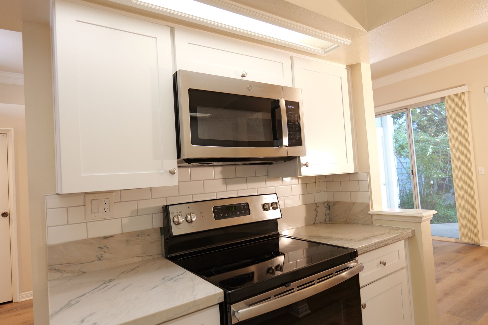 Step into a stunningly remodeled kitchen that is a chef's delight, featuring brand-new black stainless steel appliances, gleaming quartz countertops, and new flooring underfoot. The spacious and inviting living room, complete with a cozy fireplace, opens directly onto your private patio. Relax outside while enjoying the peaceful view of the community's tranquil streams and rock gardens.
